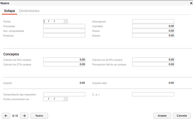 Conceptos: se muestran los conceptos configurados en la solapa Conceptos Calculados del tipo de documento. El importe de los conceptos se ingresa manualmente.