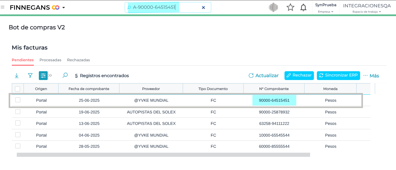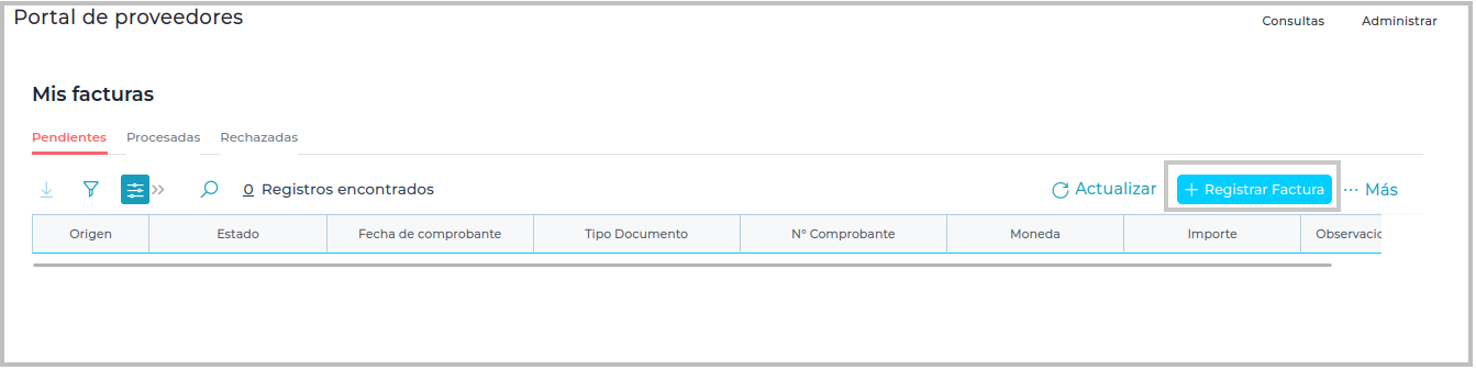 2- Ir Aplicaciones–> Portal de Proveedores → Mis facturas, se verifica que el botón Registrar Factura manual desde la solapa de pendientes está presente.