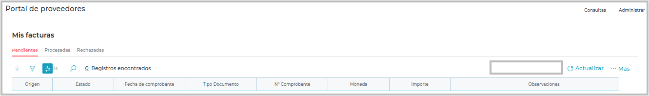 2-Ir Aplicaciones–> Portal de Proveedores → Mis facturas, se verifica que el botón Registrar Factura manual desde la solapa de pendientes desaparece.
