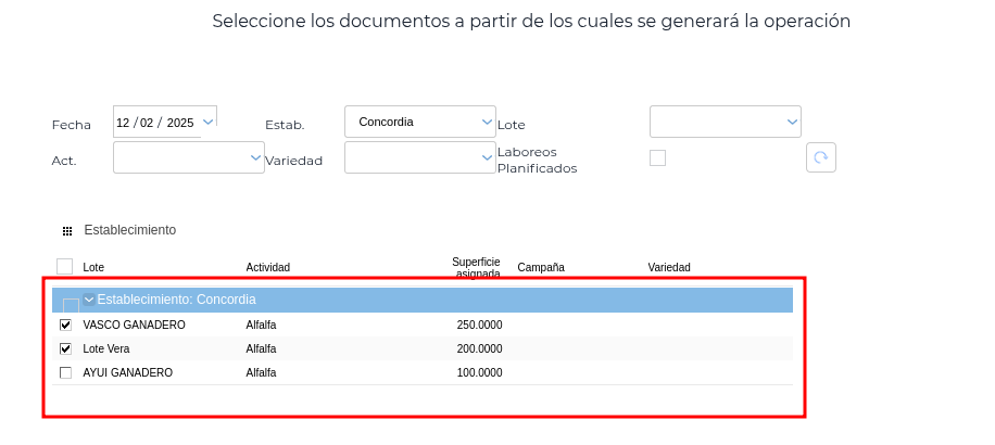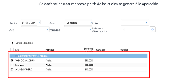 Una vez elegido el establecimiento (esto es fundamental para que se pueda obtener correctamente las asignaciones) se hará clic en el botón “Obtener Asignaciones” lo que llevará al asistente de selección de lotes que presentan asignaciones. Aquí se van a seleccionar los lotes requeridos, lo cual traerá los mismos a la transacción.
