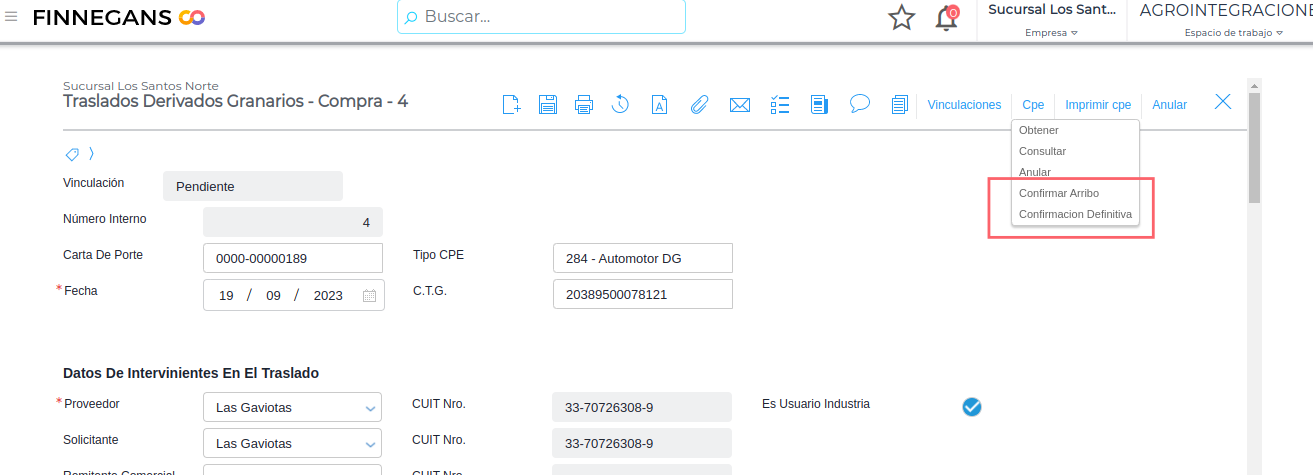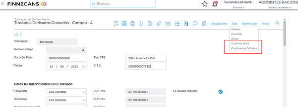 Confirmar arribo y confirmar arribo definitivo para derivados granarios de compra