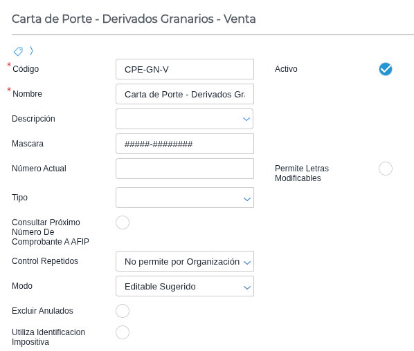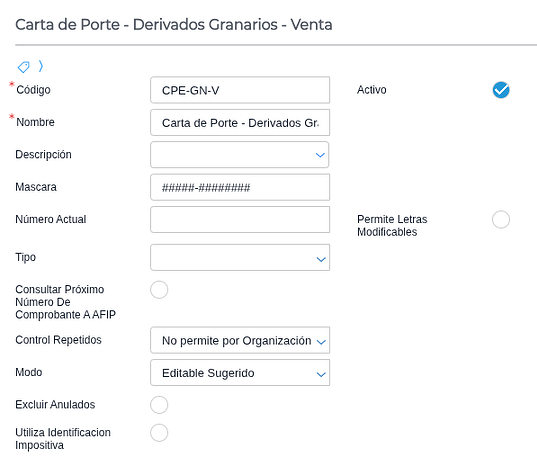 Asignar un talonario al documento con una máscara soportada por ARCA, eje: 00001-00000001.