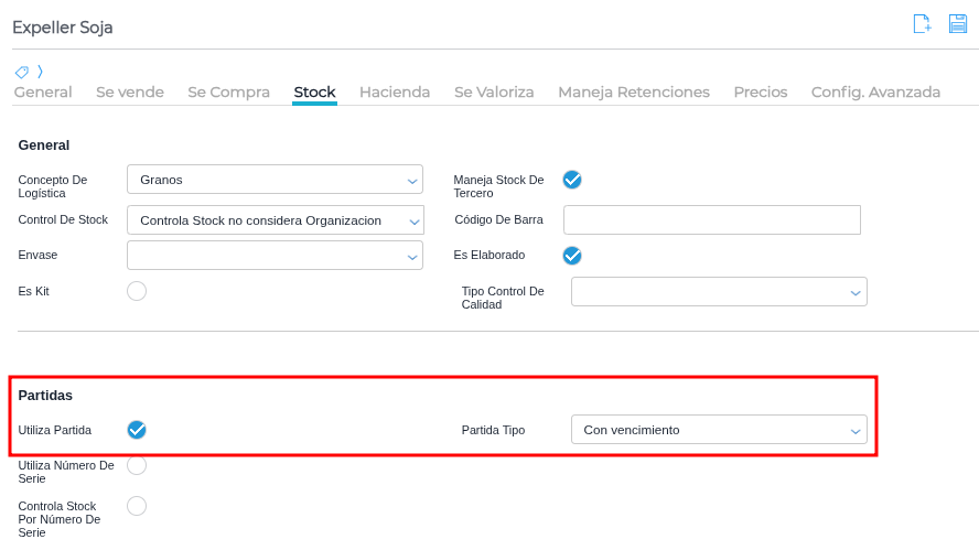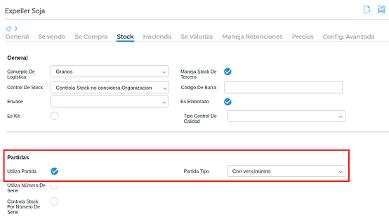 En caso de necesitar informar a ARCA el lote/partida con fecha, se configura el producto con partida y vencimiento: