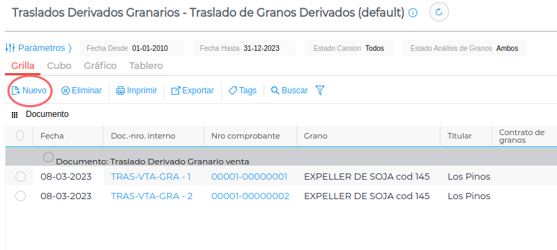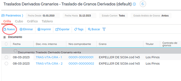 Desde la grilla de traslados hacer clic en el botón “Nuevo”: