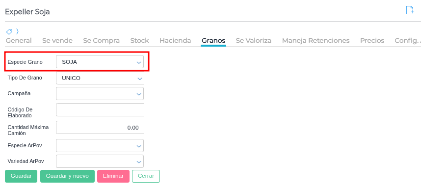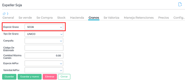 Si se trata de un producto de tipo Grano, en la solapa “granos” del producto definir la especie de grano original: