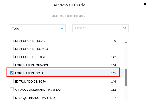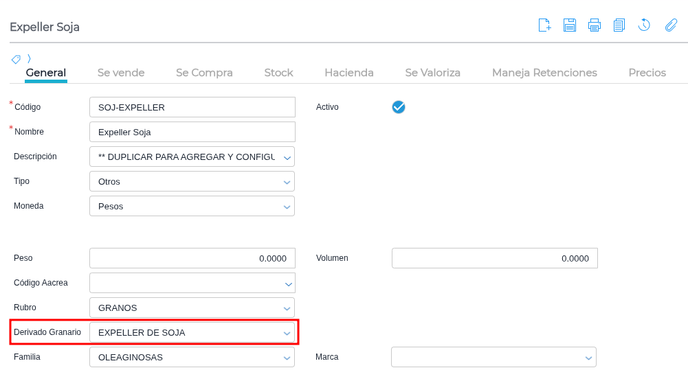 Desde el maestro de Productos, asignar el derivado granario al que corresponde el producto: