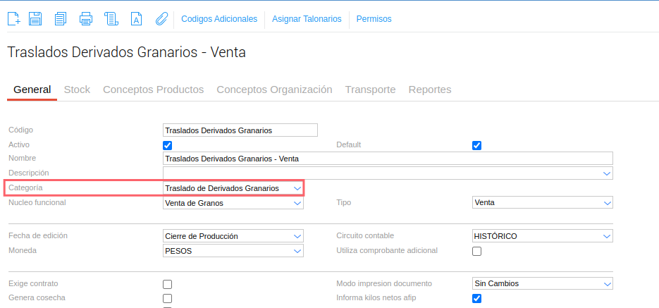 Se debe utilizar un tipo de documento de categoría “Traslado de Derivados Granarios”