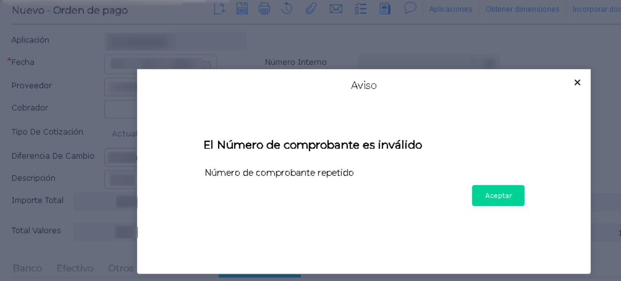 El motivo es porque el número de comprobante ya se encuentra utilizado en otra Orden de Pago.