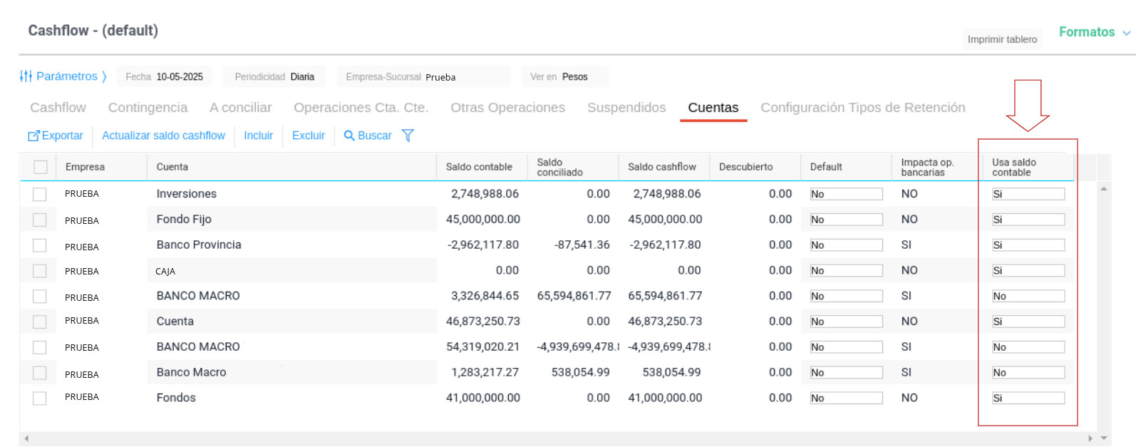 Se agregó la columna de “Usa saldo contable” en la solapa de Cuentas del Cashflow, con la finalidad de poder utilizar el saldo contable como saldo cashflow automáticamente sin tener que modificar el importe manualmente. Aplica para las cuentas que impactan en operaciones bancarias y que por default utiliza el saldo conciliado.