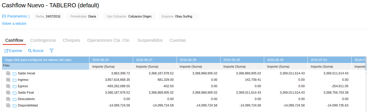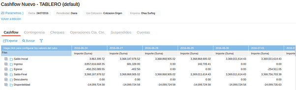 El formato de esta solapa es de tipo cubo. Permite graficar el importe según distintos parámetros en las filas y columnas, tales como cuenta, empresa o período. Por defecto, en las columnas se muestran los períodos con la agrupación indicada en los parámetros (día/semana/mes/año), y en las filas el origen (ingreso/egreso), empresa, cuenta y categoría de cada movimiento.