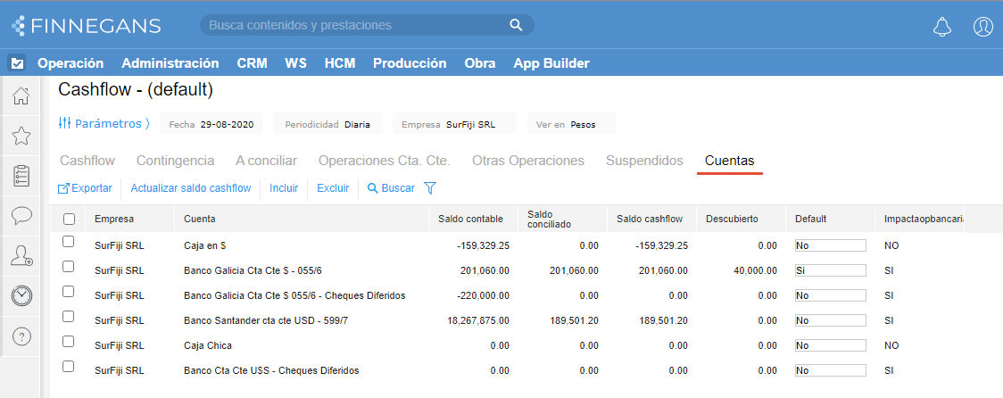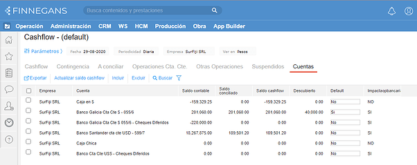 Las cuentas de disponibilidad visualizadas en esta solapa son aquellas que se incorporaron para impactar en Cashflow mediante el botón Incluir de la barra de herramientas. De la misma manera, todas las cuentas que se visualicen en la grilla pueden dejar de verse e impactar, si así se requiere, mediante el botón Excluir.