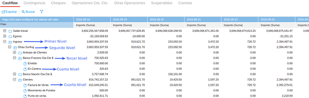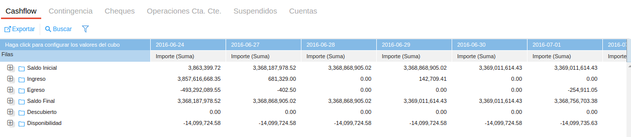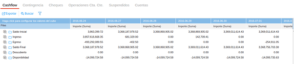 El cubo muestra una columna por cada período, según lo configurado en los parámetros (diario/semanal/mensual/anual). Cuando la periodicidad es Diaria, sólo se muestran los días hábiles. Si una transacción tiene como fecha de vencimiento un día no hábil, la misma impactará en el cashflow el primer día hábil posterior.