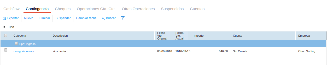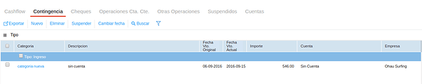 Suspender: al seleccionar un item en cualquier solapa y hacer clic en el botón Suspender, el movimiento deja de visualizarse en el cashflow.