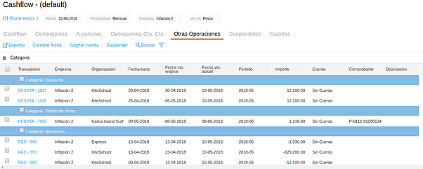 En esta solapa se reflejan todas aquellas operaciones de los circuitos de compra y venta que no impactan en cuenta corriente, tales como órdenes de compra o pedidos de venta. Al igual que la solapa Operaciones Cta Cte, permite cambiar la fecha, asignar el movimiento a una cuenta específica y suspender transacciones; todas estas acciones impactan únicamente en el cashflow, sin modificar la contabilidad ni las cuentas corrientes.