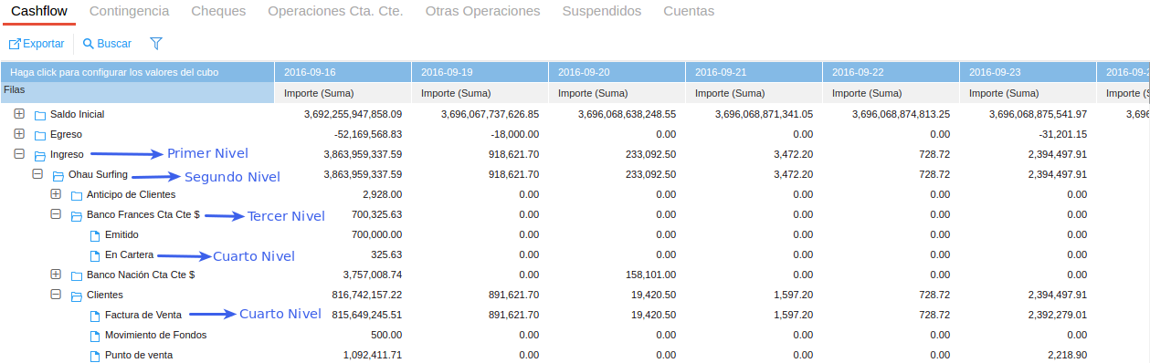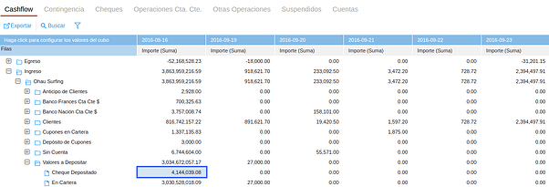 Toda la información se ve resumida en forma de cubo en la solapa Cashflow. Desde la misma, a su vez, se puede acceder al detalle del contenido de cada celda.