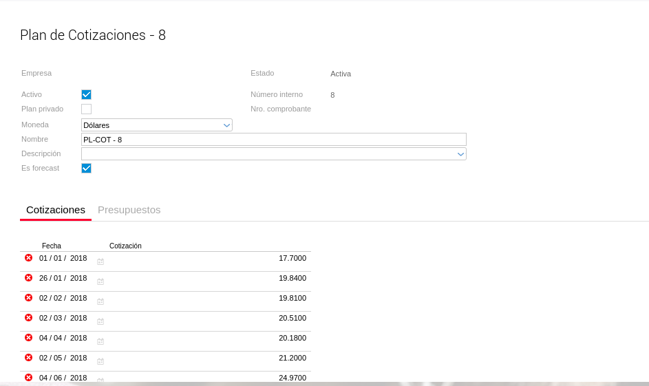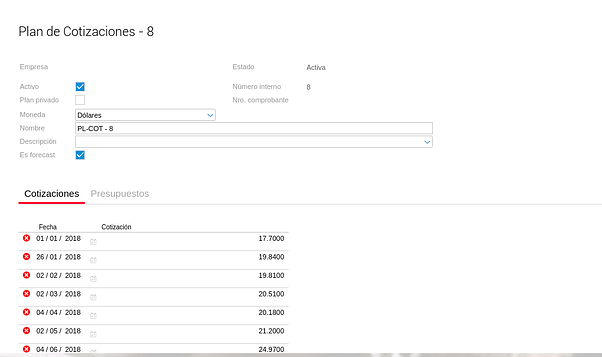 Al crear un Plan de Ingresos, siempre se deberá también cargar un Plan de Cotización para la moneda secundaria, ya que de este modo, se generarán los asientos correspondientes, y así dicho plan de Ingresos podrá ser visualizado en el Cashflow