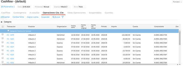 Esta solapa incluye todas aquellas transacciones con saldos pendientes en cuenta corriente, tales como facturas de compra o venta. Además, muestra aquellos documentos de los circuitos de compra o venta que se encuentren pendientes de vinculación y hayan sido configurados para mostrarse en el cashflow.