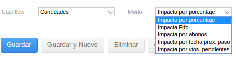 Impacta por porcentaje: las cancelaciones parciales de vencimientos en transacciones con esta configuración se distribuyen equitativamente. Ejemplo: si se tiene una orden de compra con múltiples vencimientos (ej: 30 y 60 días) y se factura sólo el 30%, en el cashflow se descuenta ese 30% equitativamente de cada uno de los vencimientos de la orden de compra.