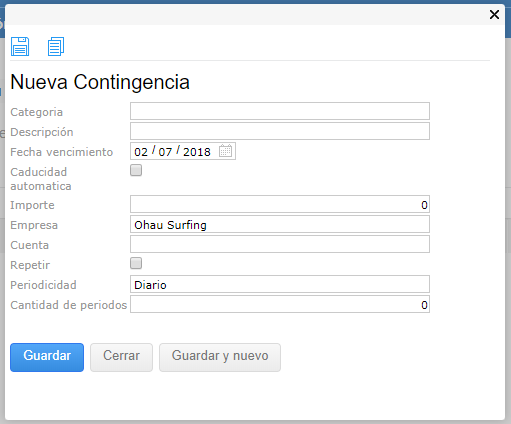 Caducidad Automática: si está activo el check box, llegada la fecha de vencimiento, se vence la contingencia y no se verá más en el cashflow.