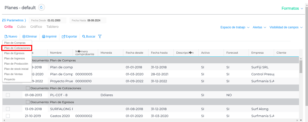 Menú → Gestión Empresarial → Presupuesto → Transacciones → Planes