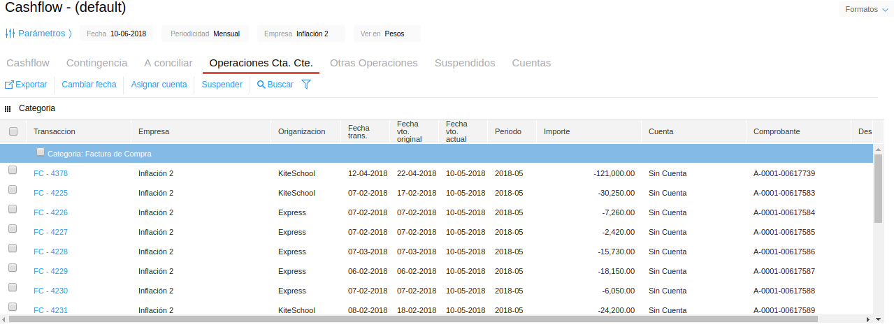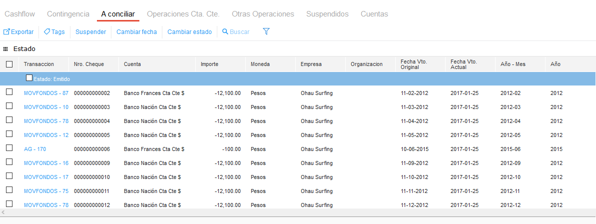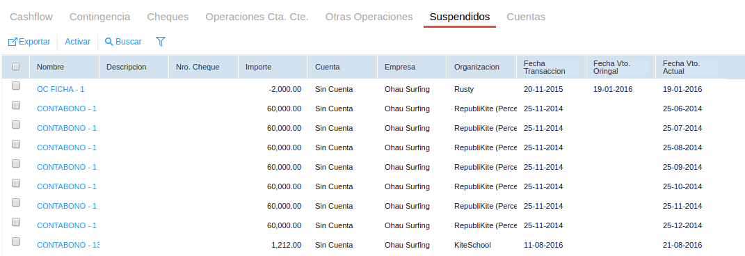 Todas las operaciones, documentos físicos, contingencias y otras operaciones suspendidas en las solapas anteriores se muestran en esta solapa. Estos movimientos no se ven reflejados en el cashflow, a menos que sean reactivados seleccionándolos y haciendo clic en el botón “Activar”.