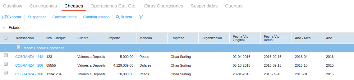 Por ejemplo, al hacer doble clic sobre el importe del estado Cheque Depositado, se muestran los cheques que componen ese conjunto.
