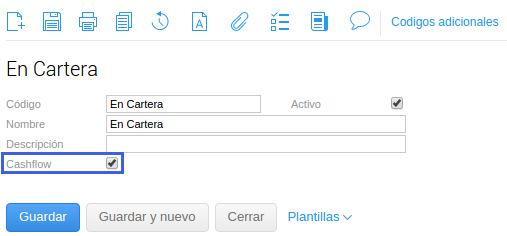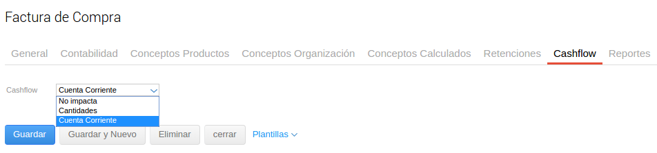 La solapa Cashflow de los tipos de documento permite configurar el impacto de las transacciones en esta herramienta.