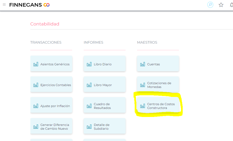 Ingresar a Menú > Gestión empresarial> Contabilidad> Centro de Costos Constructora.