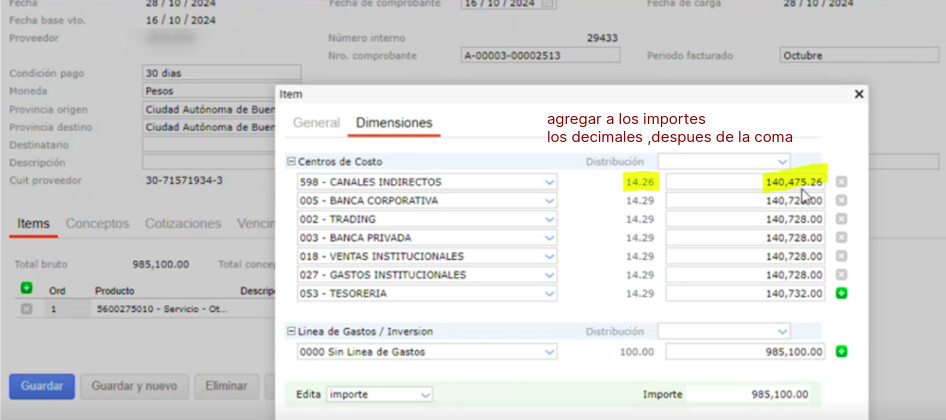 El sistema permite guardar la distribución de costos por el 100%, pero si los importes no fueron cargados con decimales, luego de guardar, el sistema se encargará de agregarle los decimales al primer ítem de la distribución.