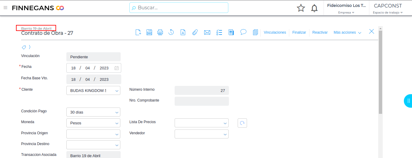 Buscar el Contrato de Obra y verificar en la parte superior del documento la sucursal en la cual se encuentra cargado.