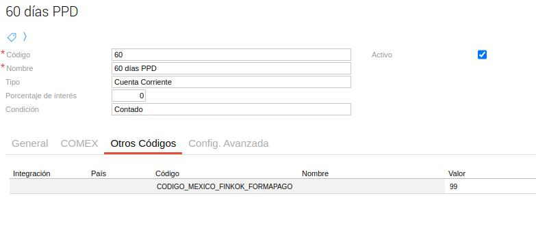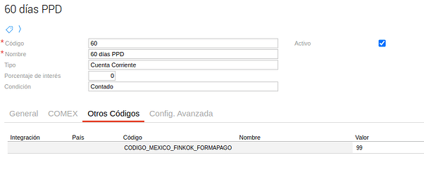 Informa el código adicional de la condición de pago de la cobranza aplicada con anterioridad al momento de timbrar.(CODIGO_MEXICO_FINKOK_FORMAPAGO)