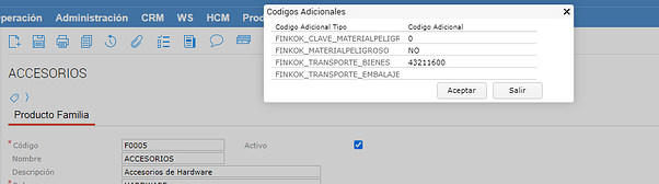En el maestro Familia de producto, se debe ingresar el código adicional FINKOK_TRANSPORTE_BIENES. (Ver tabla c_ClaveProdServ del catálogo SAT)