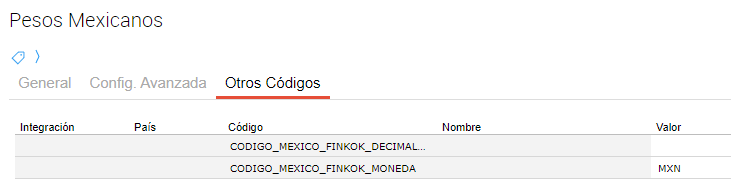 En el maestro de monedas, completar el código adicional CODIGO_MEXICO_FINKOK_MONEDA. (Ver solapa c_Moneda del catálogo SAT)