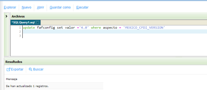 Para actualizar la versión se debe ingresar al DB Manager y ejecutar la siguiente sentencia: