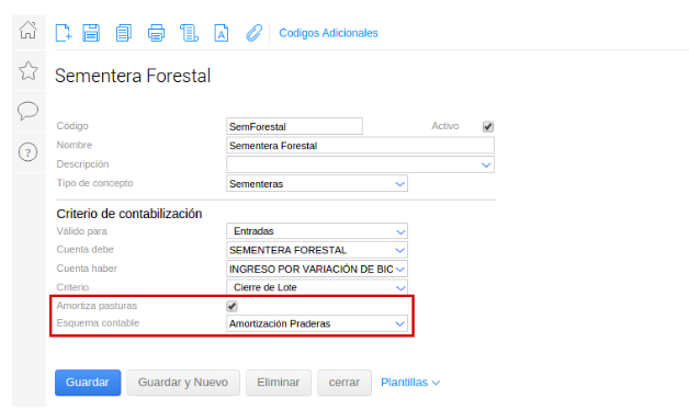 Se ingresa en la sementera forestal o frutícola y se tilda la opción de “Amortiza pasturas”. Esto va a habilitar el campo de “Esquema contable”:
