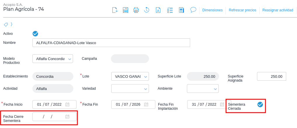 Tras crear un plan madre, existe la opción de cerrar sementera. Al tildar la opción se puede completar la fecha de cierre de sementera:
