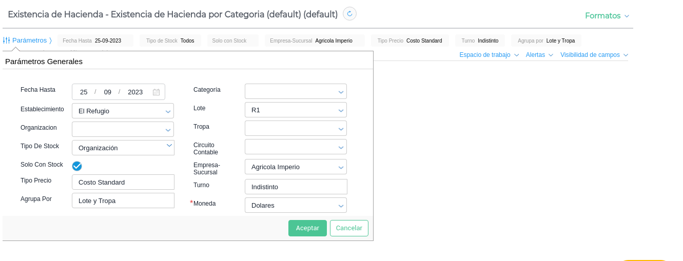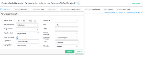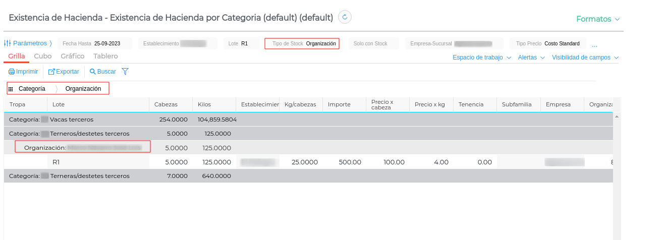 Para obtener un informe de Existencia de Hacienda se debe colocar en los parámetros Tipo de Stock: “Organización” para poder visualizar el stock cargado de terceros, colapsando por categoría y organización, obteniendo así el número de cabezas en las diferentes organizaciones.