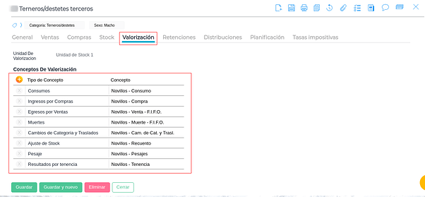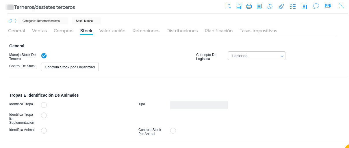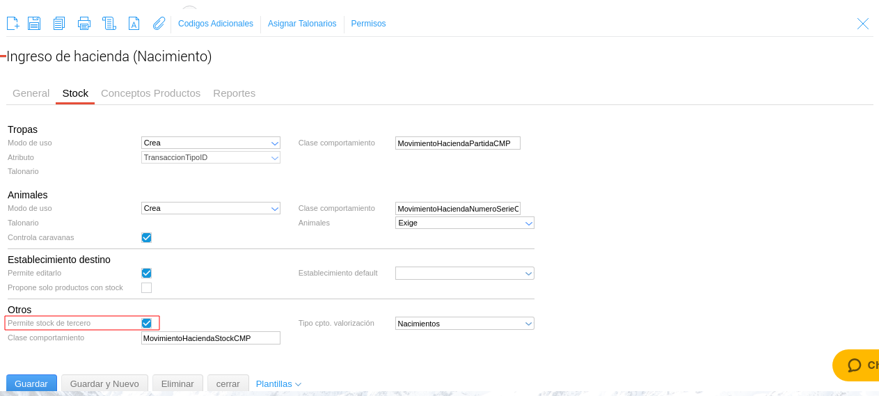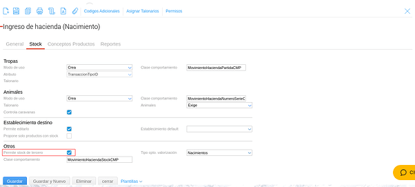 - Configurar los documentos de nacimientos, sanidad, mortandad, etc., para que manejen stock de terceros, teniendo en cuenta que al no ser stock propio no se valorizará.