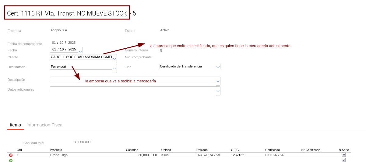 Cabe aclarar que el certificado de transferencia puede ser por el total de la mercadería entregada o puede ser por menos, ya que una opción puede ser que entreguemos cierta cantidad a una empresa y otra cantidad a otra.