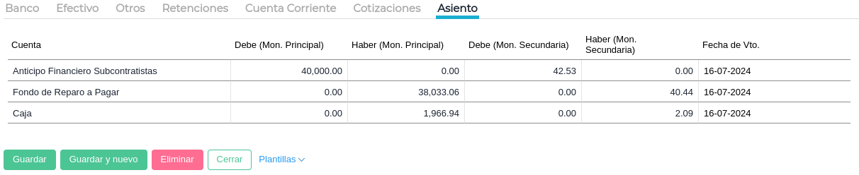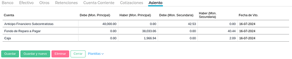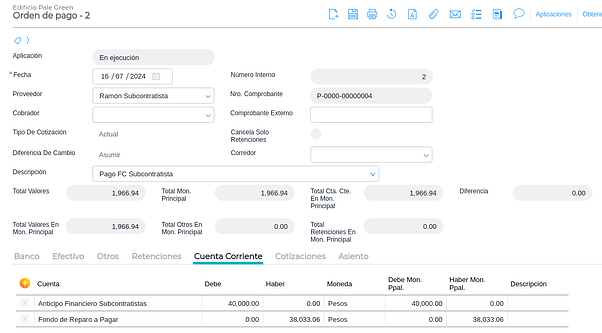 Para descontar el Fondo de Reparo, en la solapa “Cuenta corriente" agregar una línea y cargar la cuenta Fondo de Reparo a Cobrar.