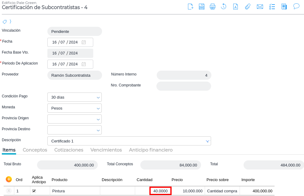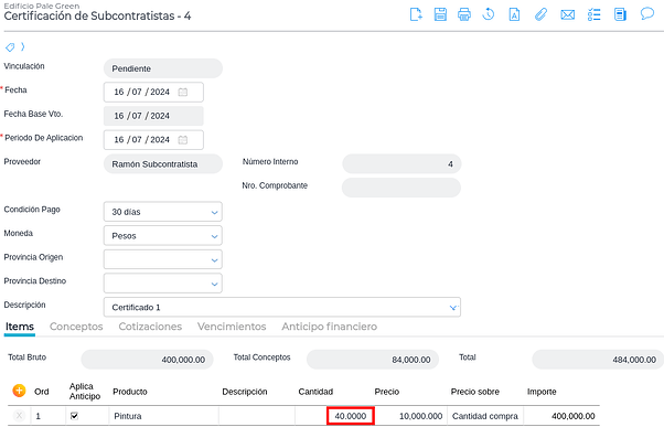 Muestra los ítems con las cantidades pendientes de certificar y se completa el incremento en importe: