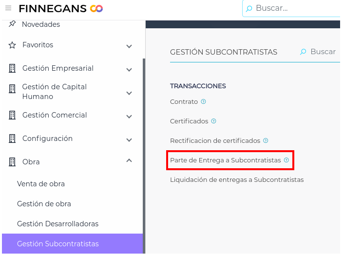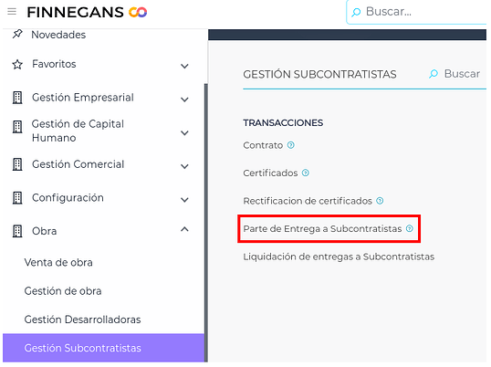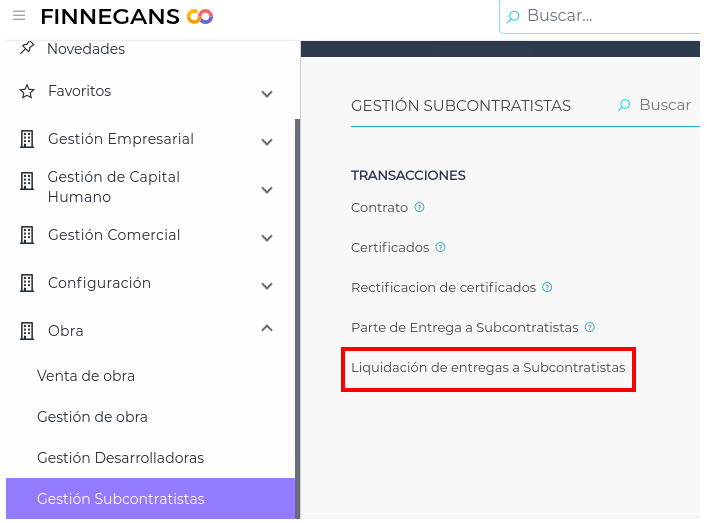 Se debe ingresar en Gestión empresarial → Obra → Gestión de Subcontratistas → Transacciones → Liquidación de entregas a subcontratistas