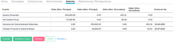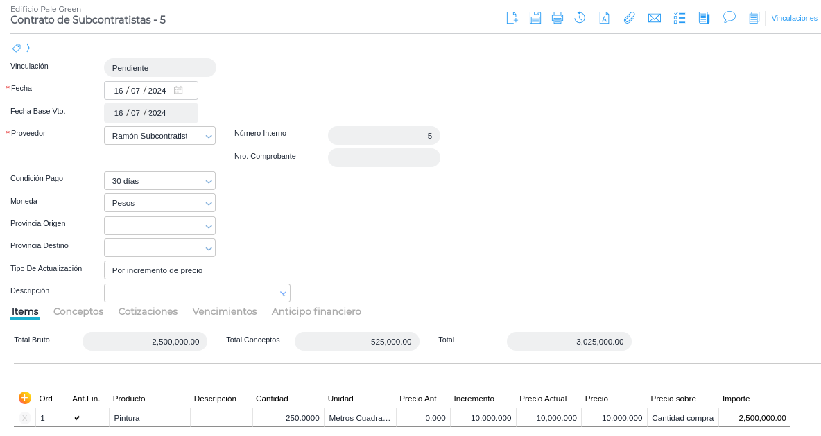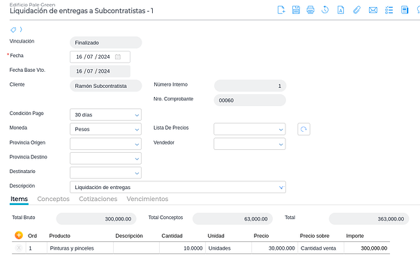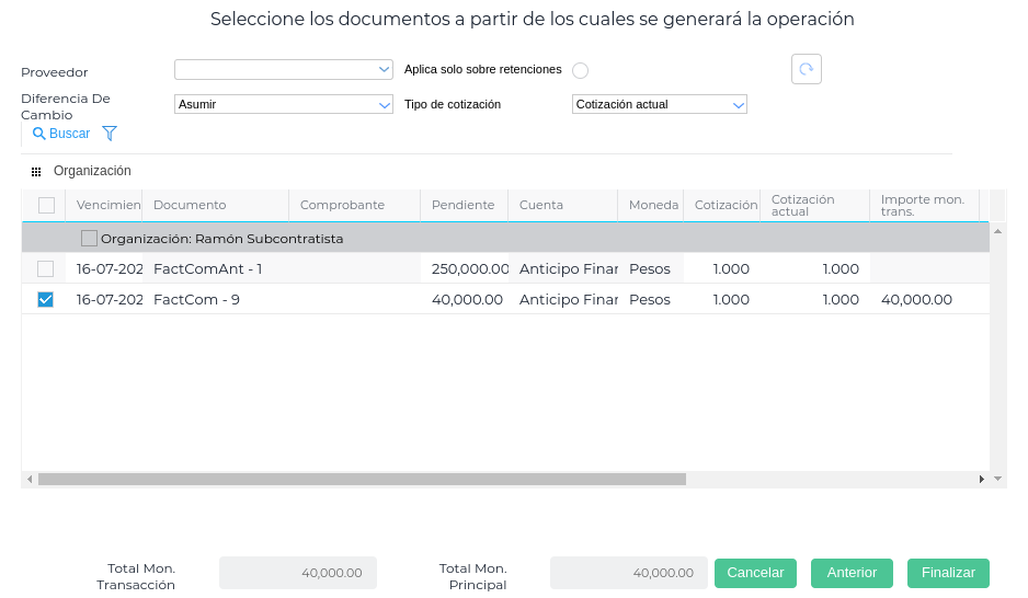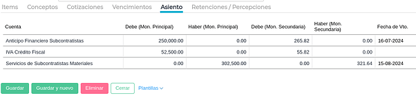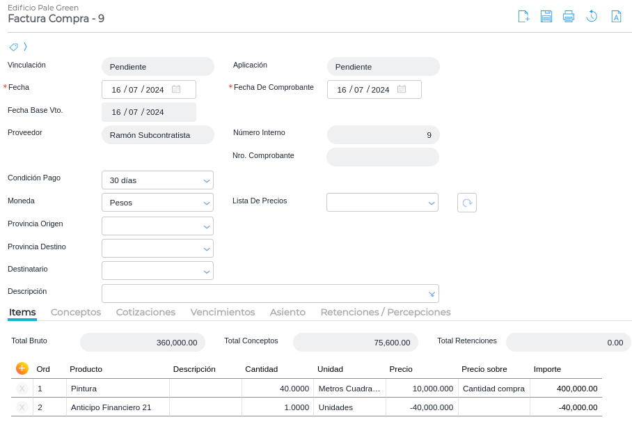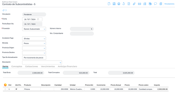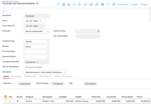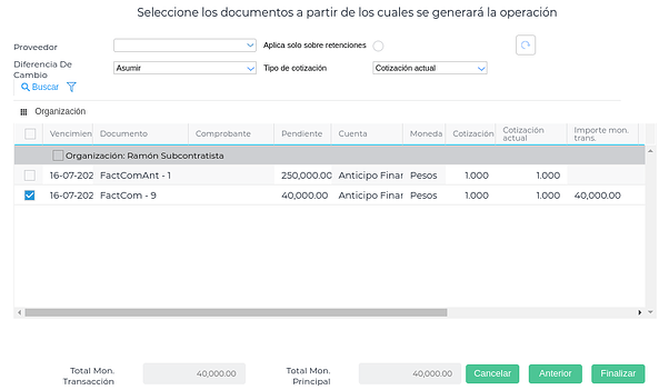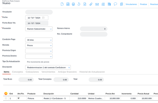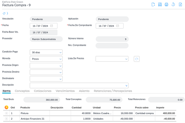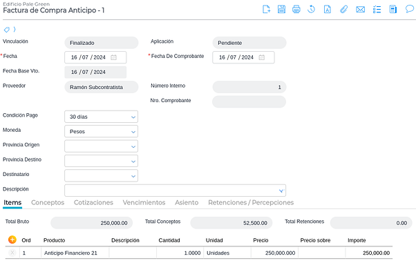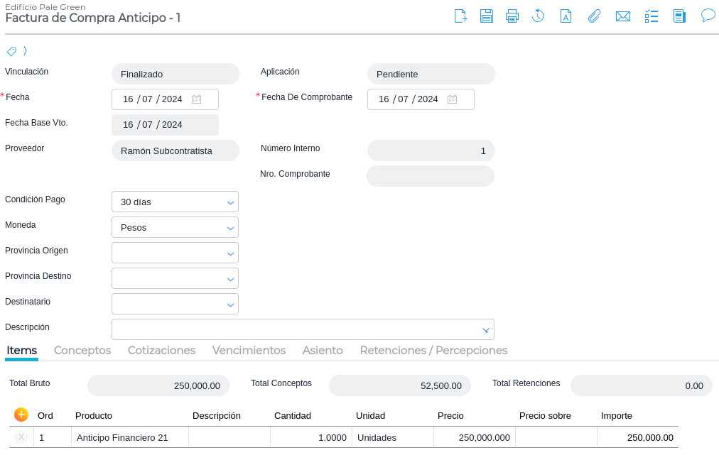 Si en el contrato de subcontratista se definió un porcentaje de anticipo financiero, debe facturarse el mismo. Se ingresa en Gestión empresarial → Compras → Facturas
