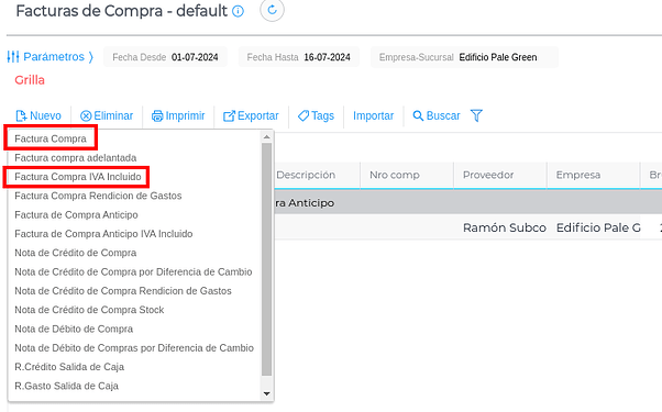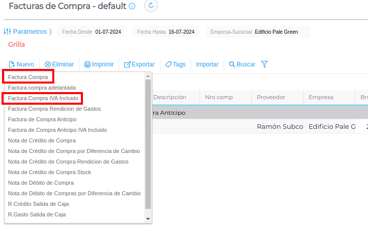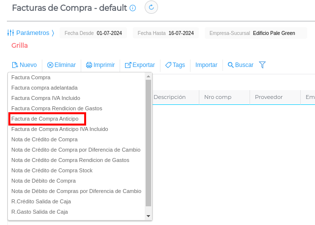 Se hace click en el botón “Nuevo” y se selecciona la Factura de compra de anticipo.