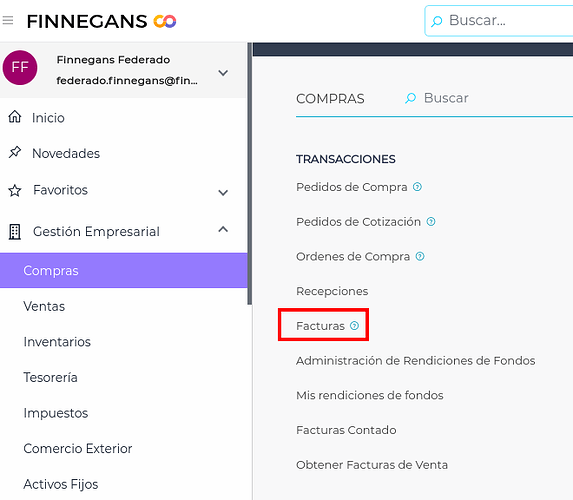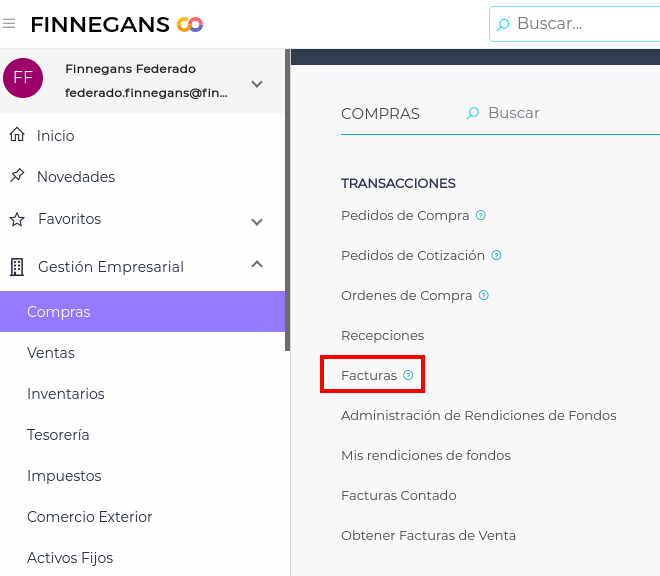 Una vez que haya Certificados emitidos, el Subcontratista emitirá una factura que se ingresa en: Gestión empresarial → Compras → Transacciones → Facturas.