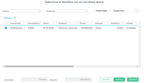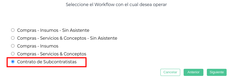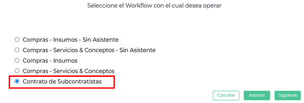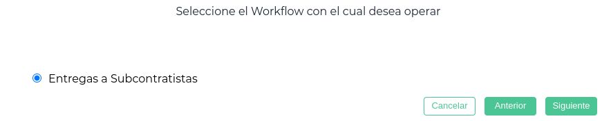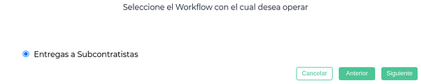 Se oprime el botón “Nuevo”. Se abre el asistente, y se debe seleccionar el workflow de “Entregas a subcontratistas”