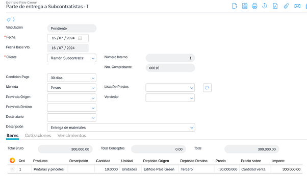 A través de esta operación se registran en el sistema las distintas entregas de materiales que se le hacen al subcontratista. En este caso el subcontratista es proveedor y a su vez cliente. Se ingresa desde Gestión empresarial → Obra → Gestión de Subcontratistas → Transacciones → Parte de entrega a subcontratistas