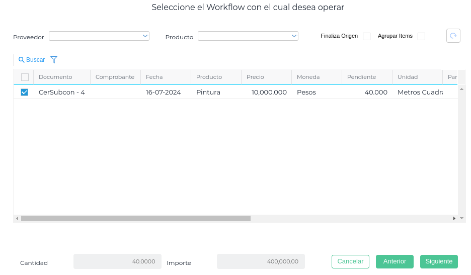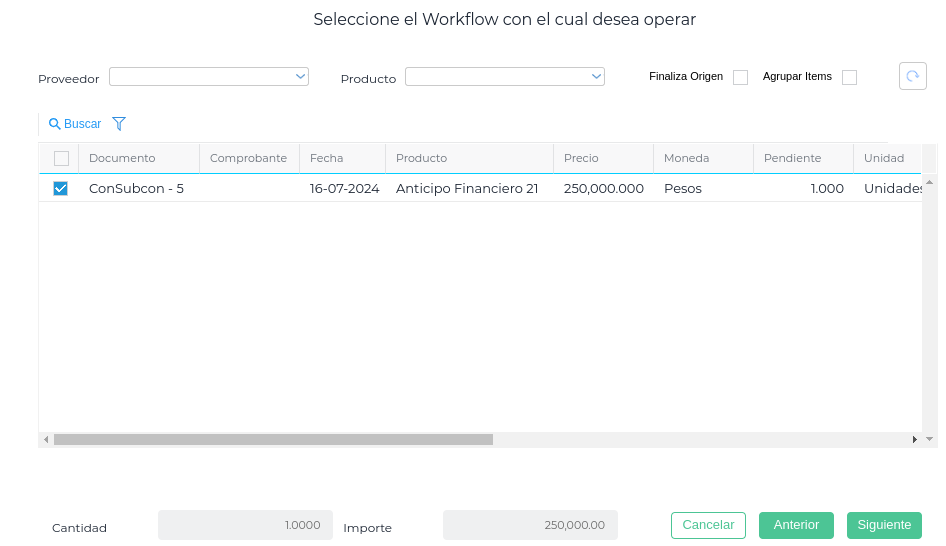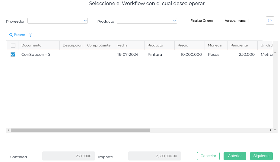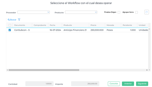 Al seleccionar la opción elegida se abre el asistente; se debe utilizar el workflow de “Contrato de Subcontratistas”, para que pueda traer todos los certificados pendientes de facturación.