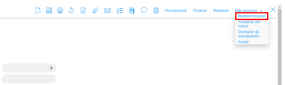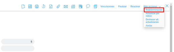 Se ingresa en el contrato a redeterminar y se oprime el botón Más acciones → Redeterminación que se encuentra en la barra de comandos y se abrirá un pop up con un nuevo Contrato para generar: