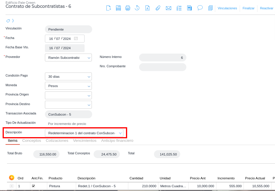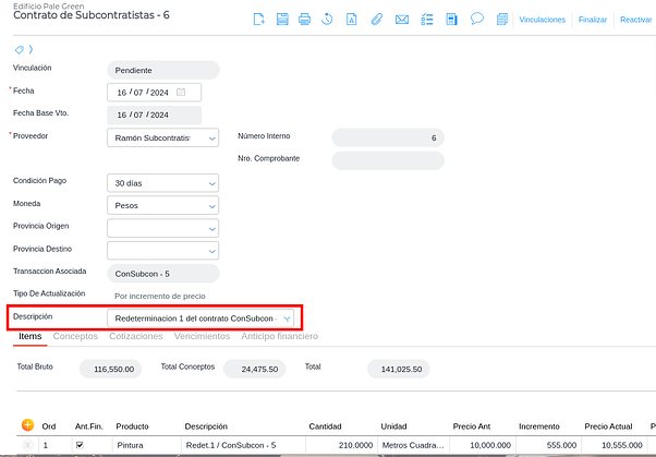 Una vez completado el incremento de precio se oprime “Guardar”. Se genera un nuevo contrato por la diferencia de precios. El sistema colocará una descripción automática indicando que se trata de una redeterminación: